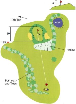 A large hollow directly in front of the green can give the wrong impression of the distance to hit. A prevailing wind, that is caused to swirl by the large trees on the right, makes club selection important. Two bunkers either side of green will gather in any shot that does not hit the green with the right shape and speed.