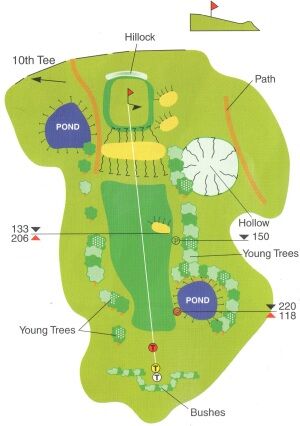 A large tree on the left and smaller trees and a water hazard on the right create a fairly tight funnel through which the tee shot must be hit. A bunker of the right to catch the wayward tee shot with anything hit inaccurately but long left or right finding the respective trees, invariably from which there is only one way out, sideways.