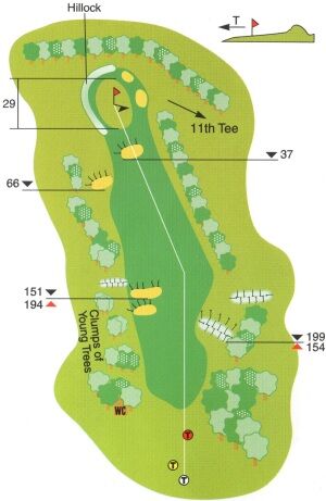 of the hole. For the longer hitter the line is over the two fairway bunkers but do not try and cut too much off the