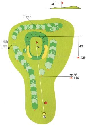 The green is the largest on the course in area but is very narrow at its entrance, widening out slightly until it passes the greenside bunkers after which it slopes down and away from the direction of the tee shot.