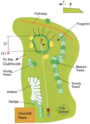 The shot has to negotiate trees on the right, a bunker short of the green protecting a fine landing area for front pin positions. The green itself has a bunker on the right and three bunkers running around the side of it to the left. The back of the green runs away, down the slope, leaving a less than easy chip back.